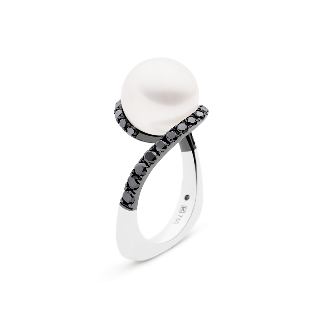 Exquisite lines embrace a lustrous Australian South Sea pearl in the Angelic Ring Noir. The deep allure of black rhodium plated gold and glistening black diamonds enhance a woman’s natural beauty.