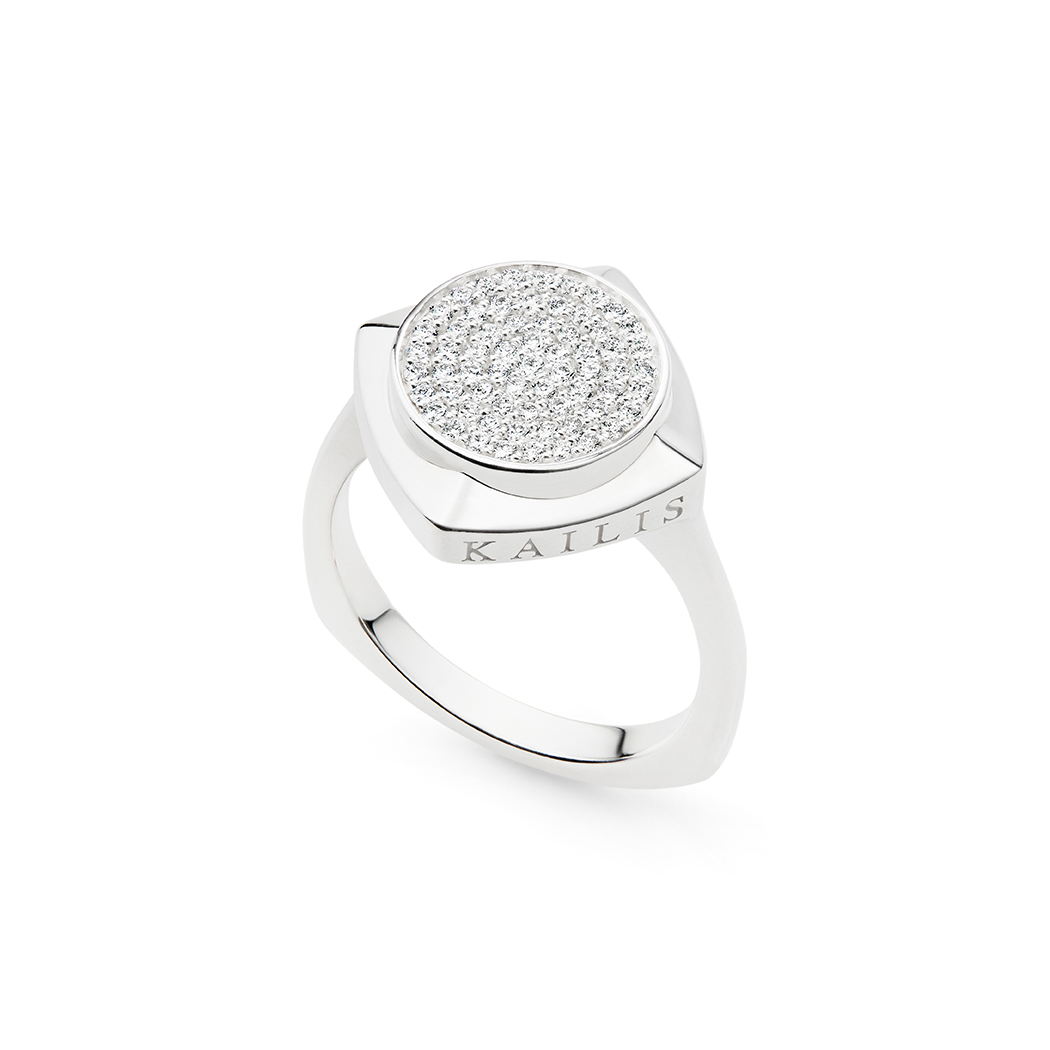 Crafted in solid sterling silver, this elegant ring features a circle of 0.34 carats of sparkling pavé set diamonds. This circle is surrounded by a signature Kailis design, the classic Tetrális shape and hallmark logo.