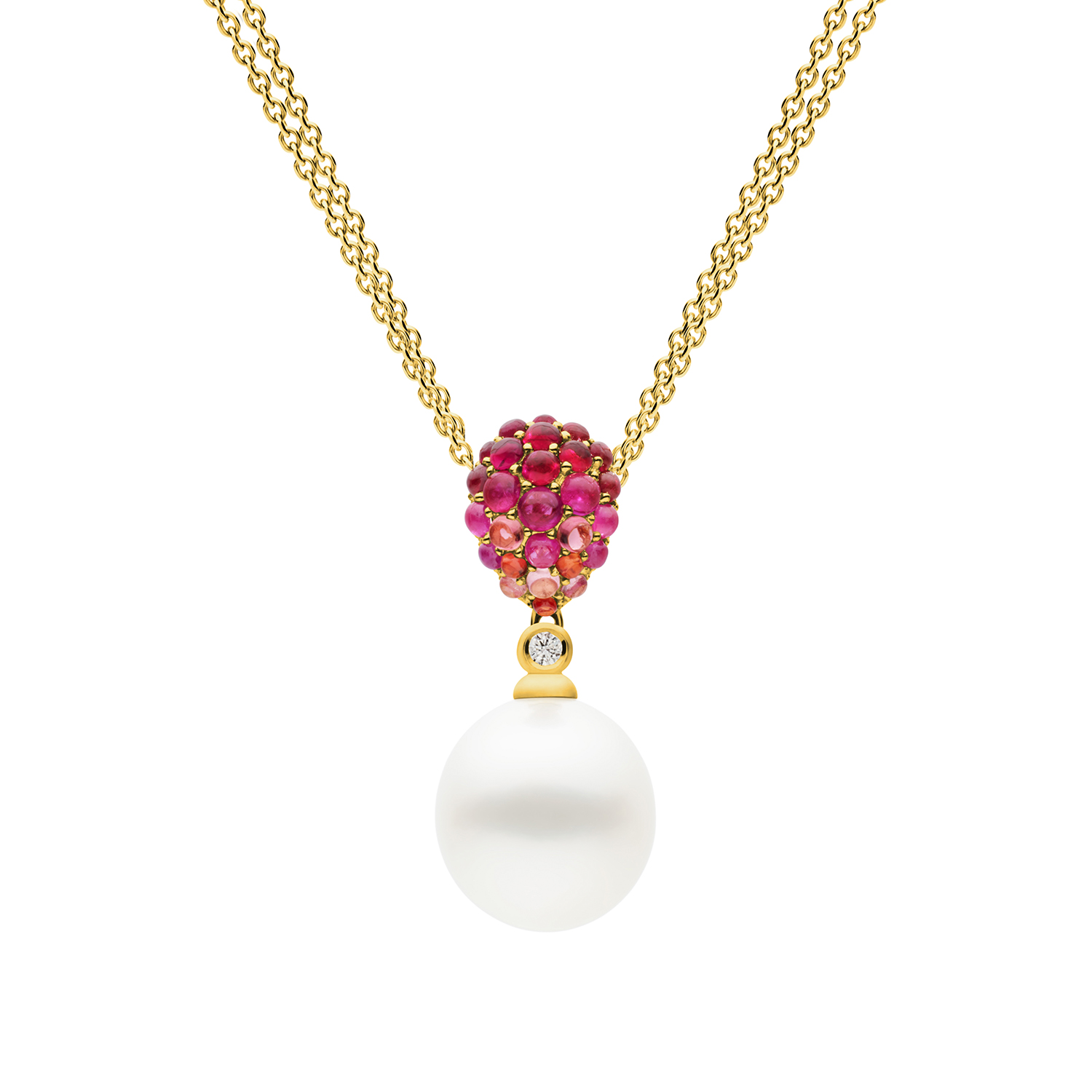 The Aurora Horizon Pendant pendant is 18ct yellow gold with grain-set Cabochon-cut Rubies, Pink Tourmalines and Orange Sapphires (27 gemstones, approx. 1.5ct); featuring a brilliant White Diamond (0.055ct) and a 13-14mm, drop-shaped, untreated Australian South Sea pearl.