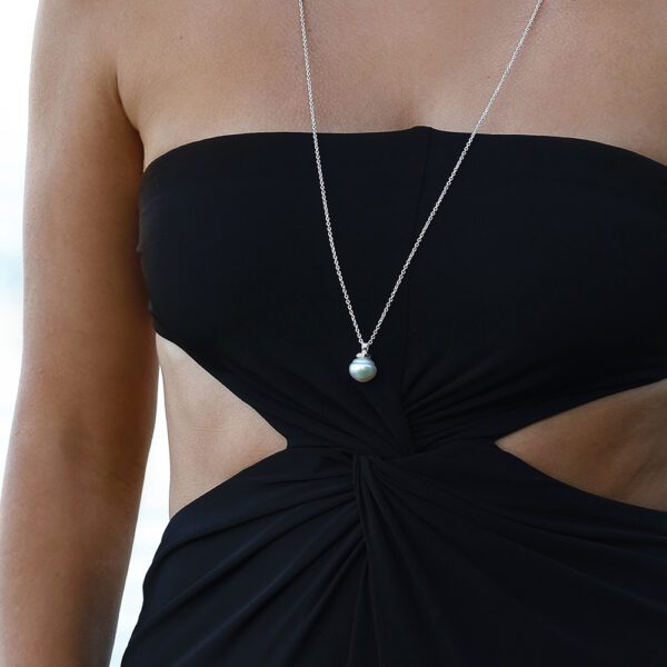 Our model is wearing an 11mm Tahitian South Sea circle pearl.