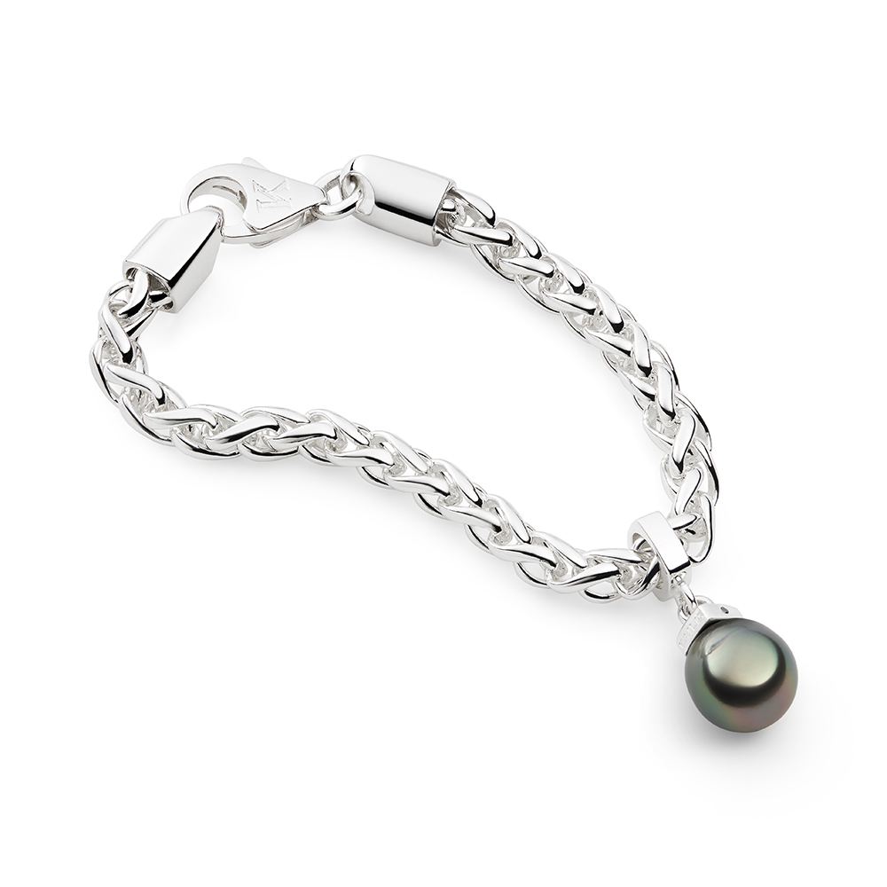 The Geometric Wheat Sliding Pearl Bracelet features a lustrous Tahitian South Sea pearl sliding freely along a heavy sterling silver wheat chain. This boldly designed bracelet makes a statement worn on its own or complemented by another Kailis piece.