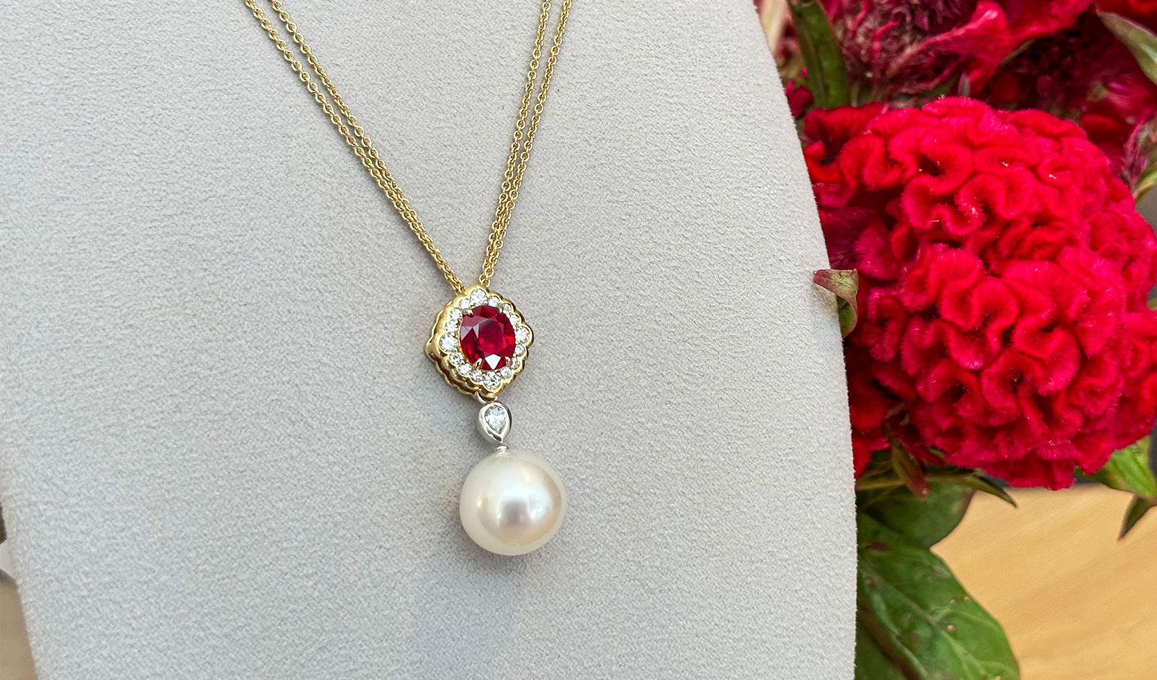 Featuring a 2.7 carat rare natural oval Burmese ruby, this piece is enchanting in its exceptionality. The centre ruby stone is haloed by 0.74 carats of sparkling white diamonds set in 18ct yellow gold. To complete the beauty of this piece, a 15mm Australian South Sea drop pearl sits articulated from a striking 0.23 carat pear cut diamond in a bezel setting.