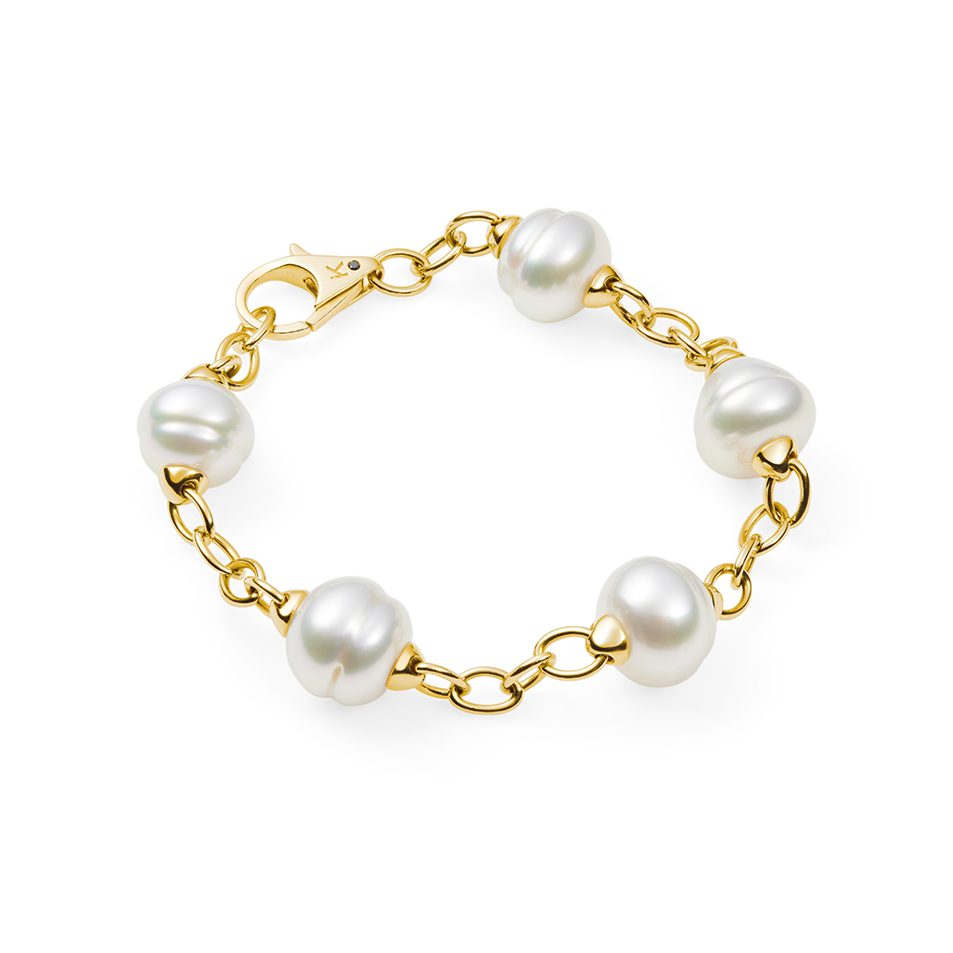 A timeless pearl bracelet designed to seamlessly transition into any woman’s fine jewellery collection. Streamlined open gold links provide the perfect framework for five lustrous Australian South Sea pearls.