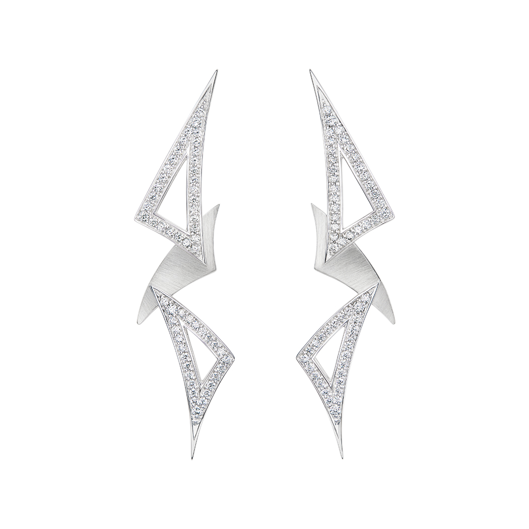 The Sails Earrings are an ode to the historic pearl luggers, the sharp lines and angular shapes forming the illusion of vast sails billowing in West Australian winds. These earrings feature a striking contrast of brushed and high polish 18ct white gold. 0.43 carats of white diamonds fills the designs’ angular shapes, like the glistening sun in a ship’s sails.
