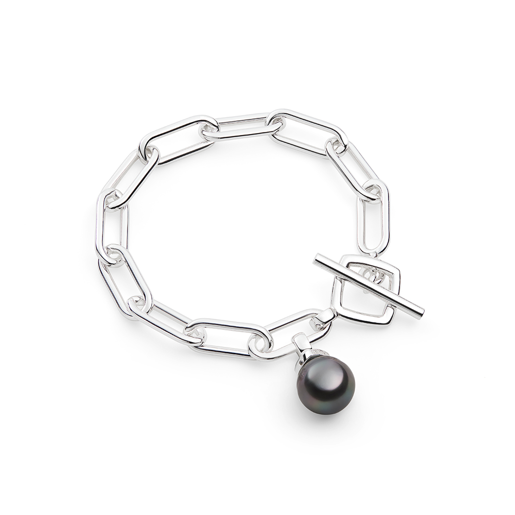 The Shackles Bracelet features an Tahitian South Sea pearl on a wide, bold open-link sterling silver chain. The stylish t-bar catch at the centre provides balance and a creative touch to this piece.