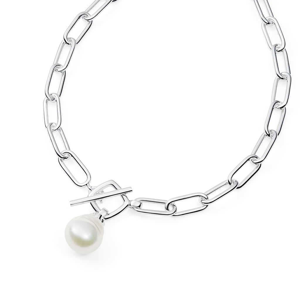The Shackles Necklace features a lustrous Australian South Sea pearl on a bold, statement wide open-link sterling silver chain. The stylish t-bar catch at the centre provides balance and a creative touch to this piece.