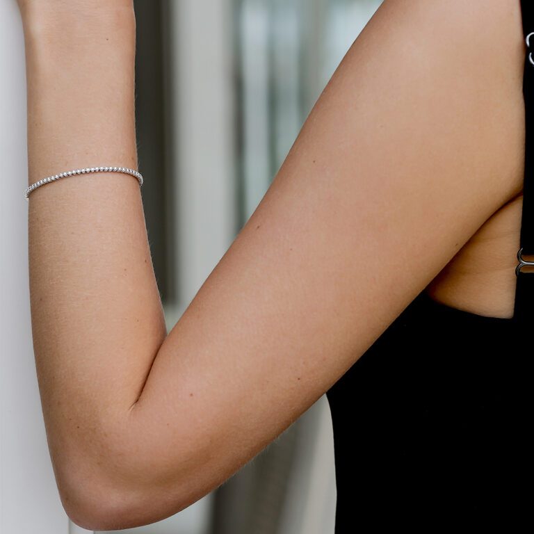 An iconic diamond bracelet design that originally got its name from being sported by players on the tennis court. This 18ct white gold bracelet showcases sparkling white diamonds in a combination of prong and bezel setting. Bestowed with our signature secret black diamond and our ‘K’ hallmark, this piece radiates timeless elegance.