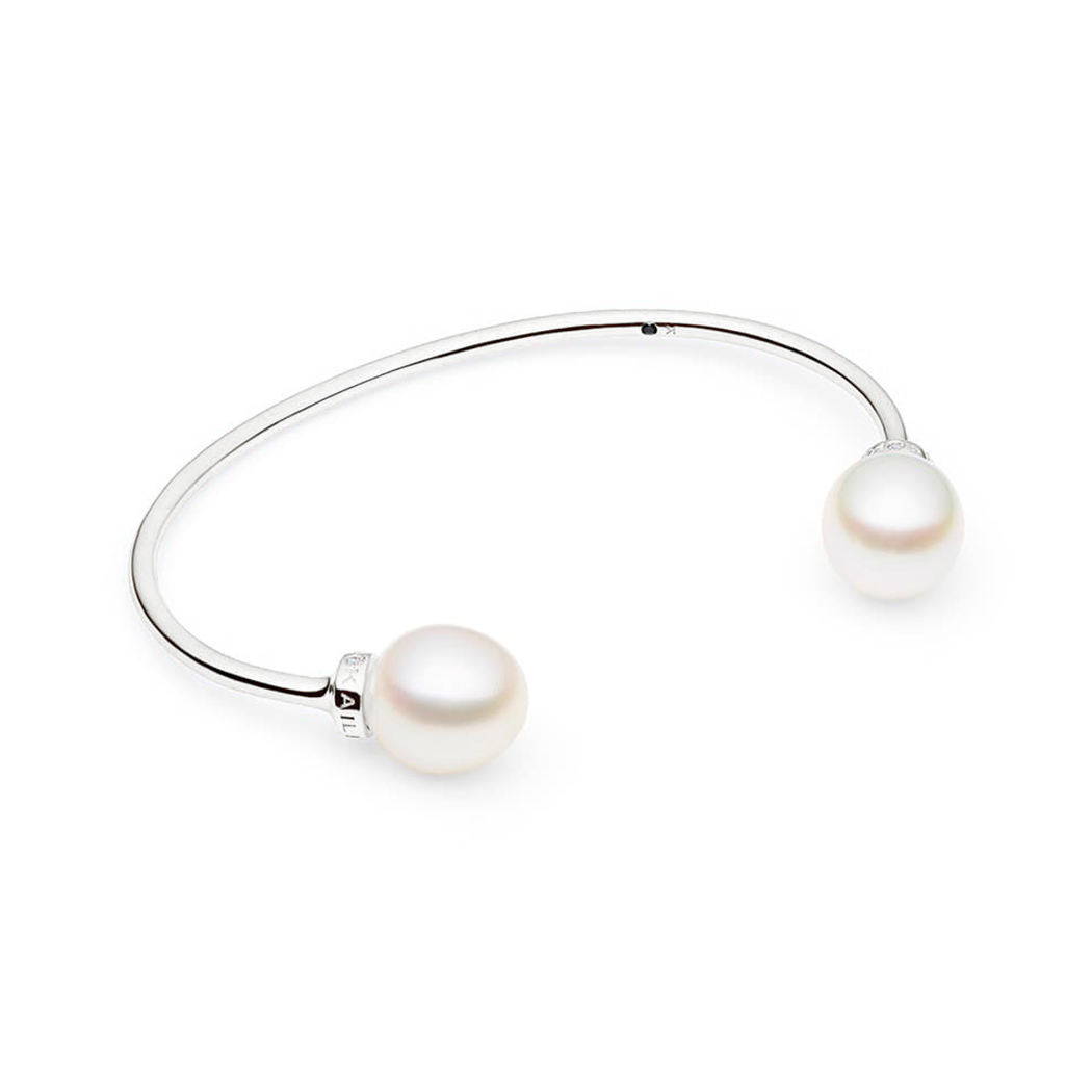 Modern minimalism meets a classic aesthetic in this refined piece. Exuding everyday elegance for the confident and discerning Kailis woman. It features 18ct white gold, white diamonds and two Australian South Sea pearls.